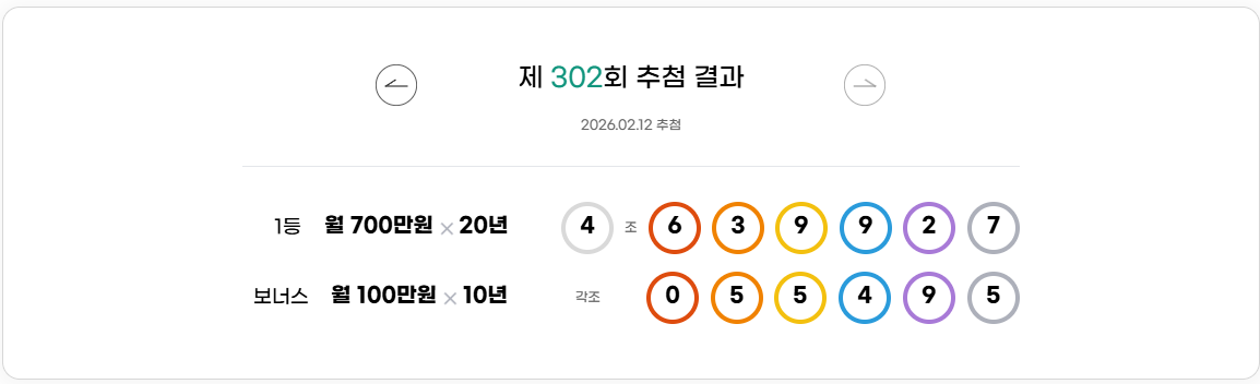 2026년 02월 12일(목요일) 추첨한 302회 연금복권720의 당첨번호는 1등(월 700만원 20년) [4조 6, 3, 9, 9, 2, 7], 보너스(월 100만원 10년) [각조 0, 5, 5, 4, 9, 5] 입니다.
