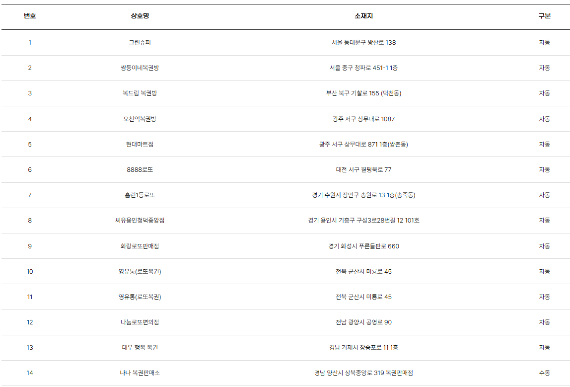 | 13 | 대우 행복 복권 | 자동 | 경남 거제시 장승포로 11 1층 | 1 |